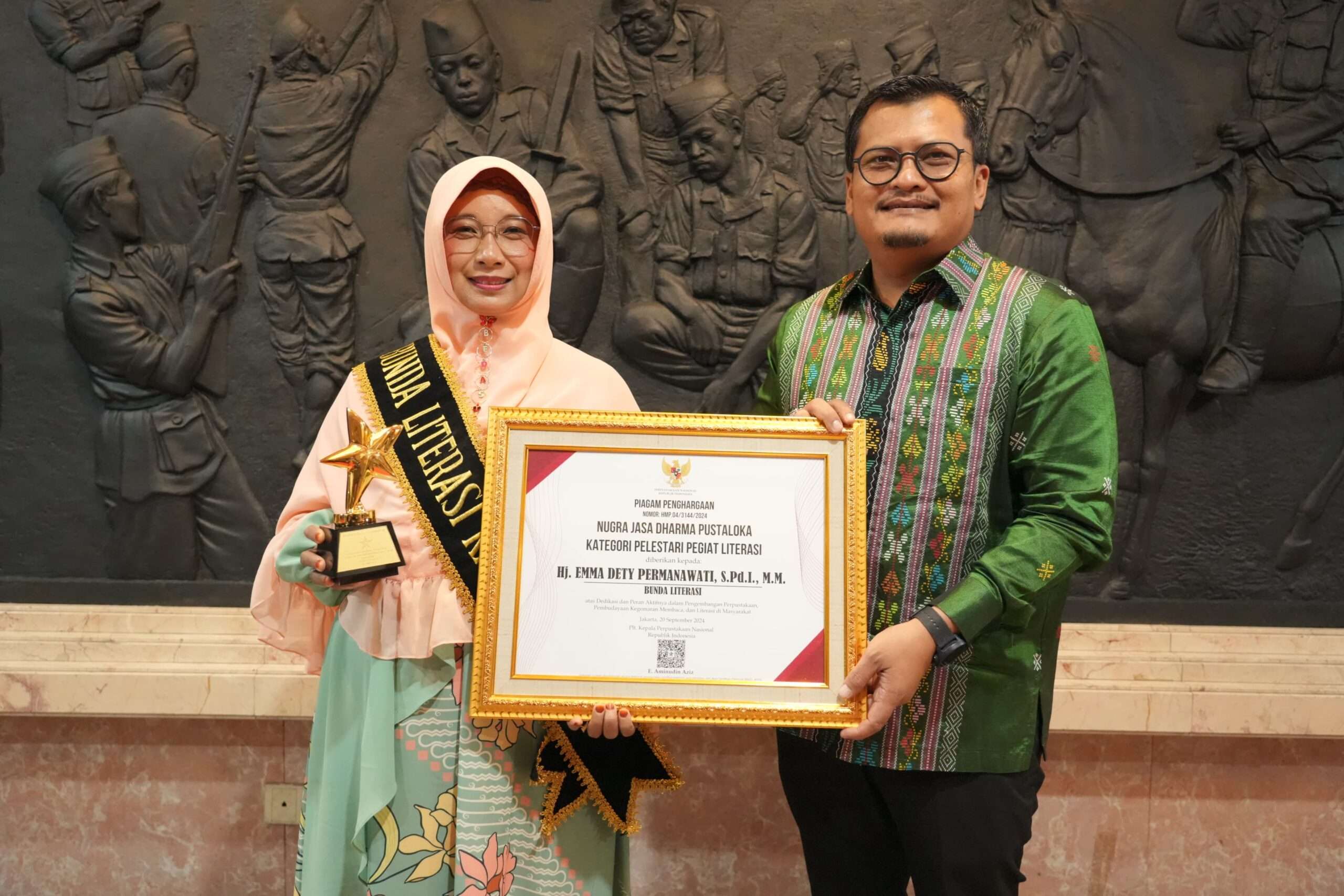 “Saya selaku Bunda Literasi mendapatkan piagam penghargaan Nugra Jasa Dharma Pustaloka kategori pelestari pegiat literasi,” kata Emma Dety usai menerima penghargaan tersebut.